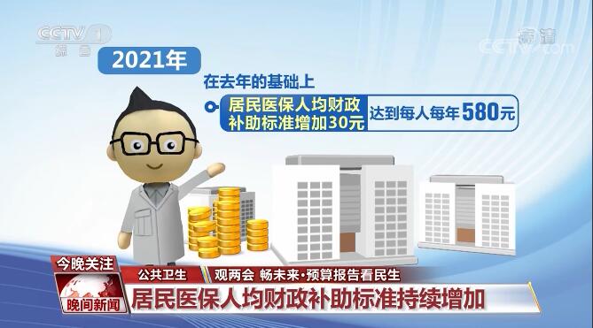 公共衛生投入也將強化。預算報告指出,2021年居民醫保人均財政補助標準增加30元,達到每人每年580元。對醫保基金負擔的新冠病毒疫苗及接種費用給予補助,支持實施居民免費接種政策。