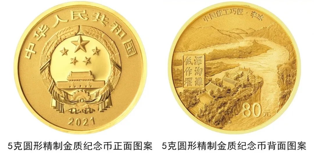 5克圓形金質紀念幣背面圖案為都江堰水利主體工程,輔以文字“深淘灘低作堰”,并刊“中國能工巧匠·李冰”字樣。