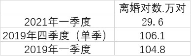 根據第一財經記者梳理,去年四季度單季度離婚登記人數是106.3萬對,因此,從環比來看,今年一季度離婚登記人數下降了72.15%。同比來看,由于2020年一季度受疫情因素影響,數據不具有可比性,因此拿2019年一季度來做比較;2019年一季度離婚登記人數為104.8萬對,今年一季度比兩年前降幅達71.76%。