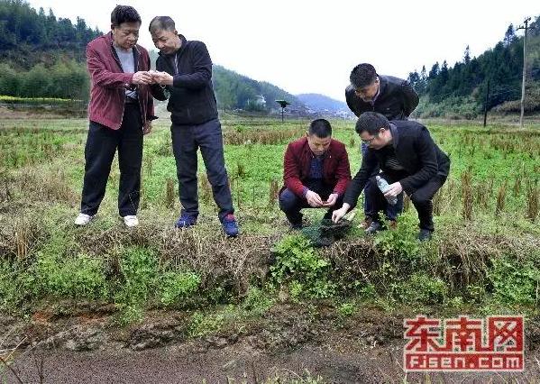 省農科院科技特派團專家在光澤縣仁厚村稻花魚示范基地調研紅萍越冬情況。