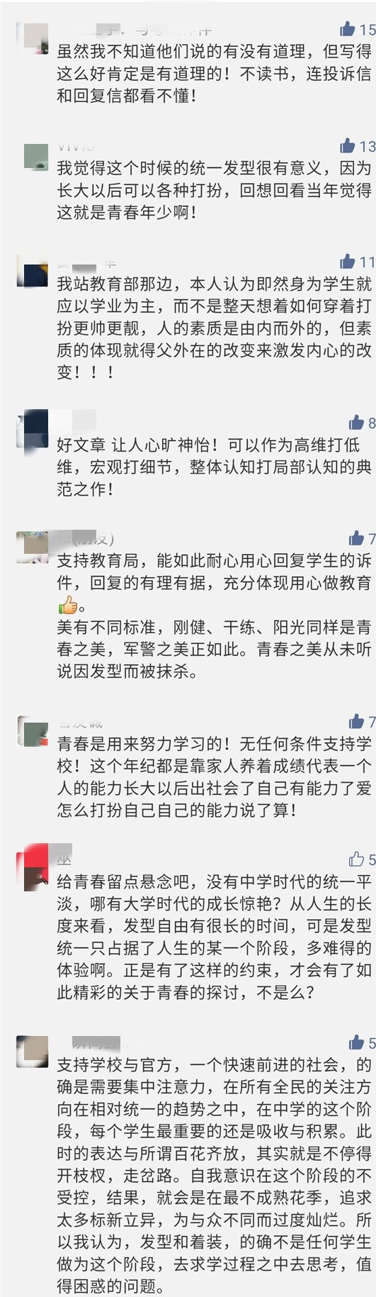 近日,“福州中學生為何要統一發型?這個學生投訴亮了!市教育局回復更亮……”的新聞在朋友圈引發好評熱議。