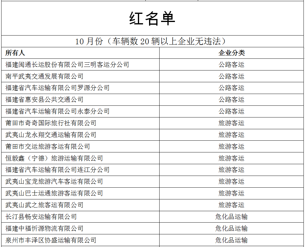 交警總隊有關人士介紹,公布的10月份運輸企業“紅黑榜”,是從全省車輛數在20輛以上的公路客運、旅游客運、危化品運輸、中重型貨運四類企業中,梳理出的單車道路交通違法率較高的企業和無車輛道路交通違法的企業。