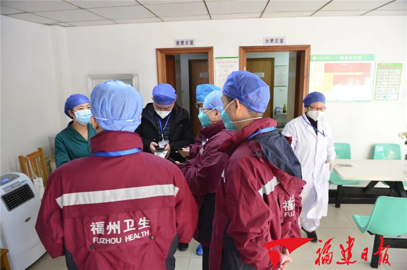 福建醫(yī)療隊(duì)醫(yī)護(hù)人員聽取宜昌市三醫(yī)院醫(yī)護(hù)人員介紹病區(qū)和病人的救治情況。