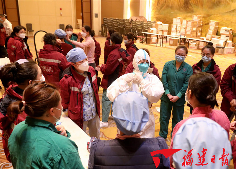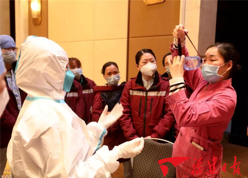 福建醫(yī)療隊(duì)員進(jìn)行隔離病區(qū)的防護(hù)培訓(xùn)。