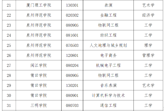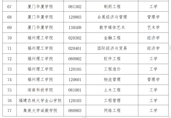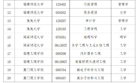 根據福建省學位委員會、福建省教育廳《關于調整學士學位授權專業增列審核工作的通知》(閩學位〔2015〕4號)和《關于2016年高等院校增列學士學位授予單位和授權專業審核工作有關事項的通知》(閩學位辦〔2016〕9號)精神,在院校自行審核申報基礎上,省學位辦根據有關文件精神進行了認真復核,經研究,同意廈門大學等26所院校的西班牙語等77個本科專業增列為學士學位授權專業。現予以公布。