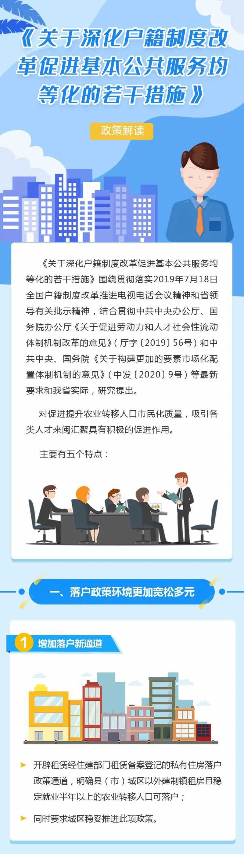 據福建公安公眾服務網28日發布的消息:為貫徹落實黨中央、國務院關于深化戶籍制度改革工作部署,促進基本公共服務均等化,經省政府同意,并經省委全面深化改革委員會第九次會議審議通過,福建省公安廳、福建省發展和改革委員會近日印發《關于深化戶籍制度改革促進基本公共服務均等化的若干措施》,提出十三條措施。