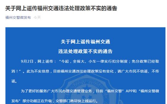 網(wǎng)傳消息稱:今起,全省大、小車一律實行扣分制度;免分政策已經(jīng)取消!并落款為福州公安局交警總隊。
