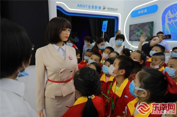 第三屆數字中國建設峰會期間,東南網策劃并進行網絡視頻直播,聚焦展示成果展上亮相的“黑科技”、新成果。圖為AI機器人與小朋友互動。