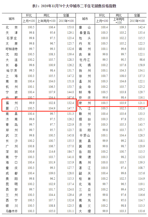 其中,福州新建商品住宅銷售價格環比上漲0.5%,同比上漲3.5%;二手住宅銷售價格環比下跌0.1%,同比上漲2.8%。廈門新建商品住宅銷售價格環比上漲0.4%,同比上漲4.4%;二手住宅銷售價格環比上漲0.5%,同比上漲4.9%。泉州新建商品住宅銷售價格環比上漲0.2%,同比上漲5.6%;二手住宅銷售價格環比上漲0.5%,同比上漲3.9%。
