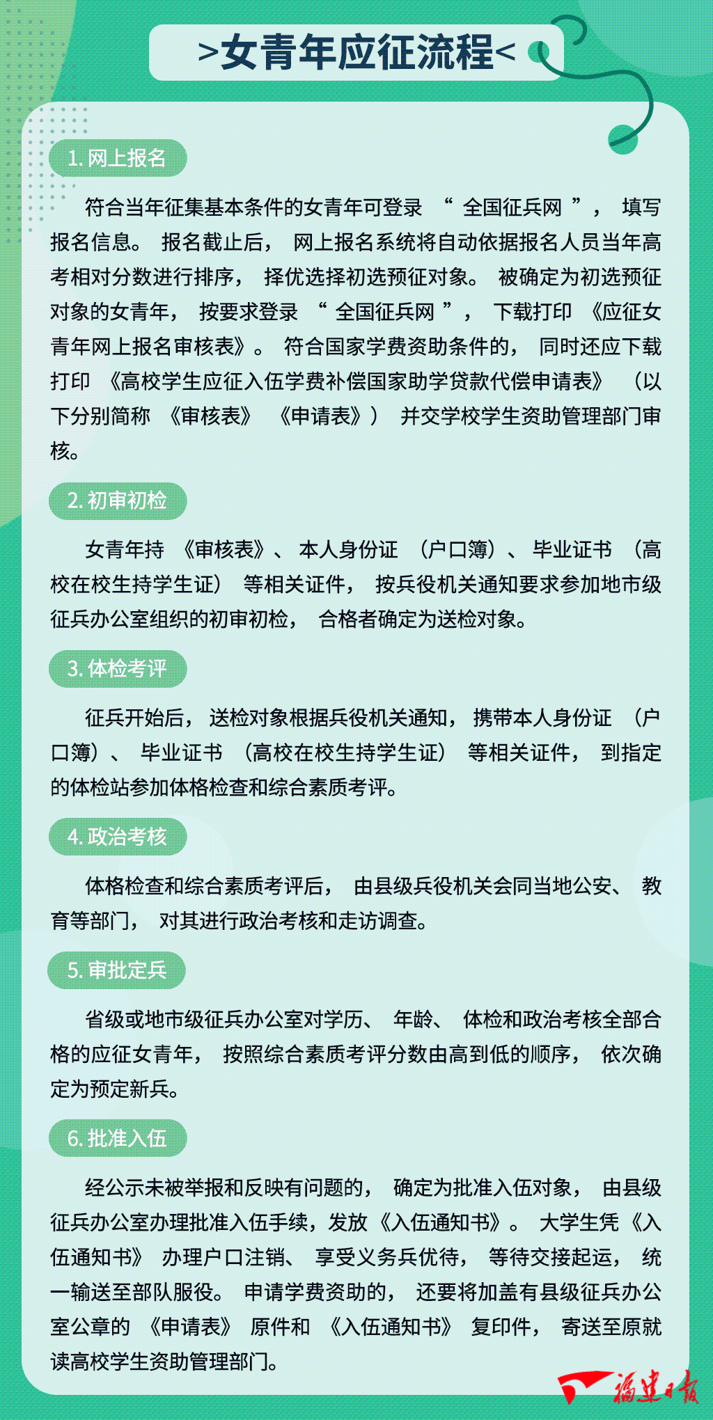 女青年:上半年:普通高等學校全日制應屆畢業生及在校生,年滿18至22周歲;2020年普通高等學校全日制應屆畢業生可以報名參加2021年上半年女兵征集,年齡放寬至23周歲。