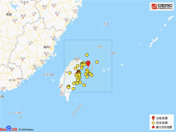 歷史地震:根據(jù)中國(guó)地震臺(tái)網(wǎng)速報(bào)目錄,震中周邊200公里內(nèi)近5年來(lái)發(fā)生4級(jí)以上地震共183次,最大地震是2019年4月18日在臺(tái)灣花蓮縣海域發(fā)生的6.7級(jí)地震(距離本次震中111公里),按震級(jí)大小前50次歷史地震分布如圖。
