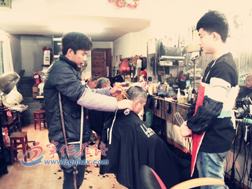 ??? 1982年,張永興永遠地走出了校門,那年他才15歲。他從不把自己當成一個殘疾人,更不想呆在家里吃閑飯。1983年,張永興獨自找到淮土街上的理發師黃旺龍,并拜他為師,悉心學習理發技術。為了方便活動,在縣竹編廠當機修工的叔叔張捷發專門給他焊了一根4公斤重的鐵拐杖,這根鐵拐他一直用到現在。1985年,張永興出師,因缺少開店資金,他只好走村串戶上門理發,一干就是一年。“淮陽、橋頭兩個村1000多人口,他們的頭發長年由我理,那時一出去就是一整天,中飯也是村民請著吃。”談起創業經歷,張永興感慨道,當年發型少,大家熱衷于理平頭和蘑菇頭,賺錢不多,但是能夠靠雙手掙錢,他很開心。