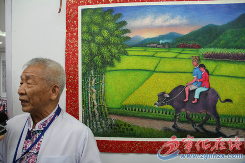 ? ? “這次征集書畫,我很重視,幾易其稿。我的畫要永遠留在寧化,讓客家鄉親進一步了解臺灣的風土人情,加深海峽兩岸人民的感情。”10月14日,寧化“祖地情?中國夢”海峽兩岸客家書畫展現場,油畫《兩岸遍地黃金》的作者余秀雄一現身,就被眾多媒體記者團團圍住接受采訪。