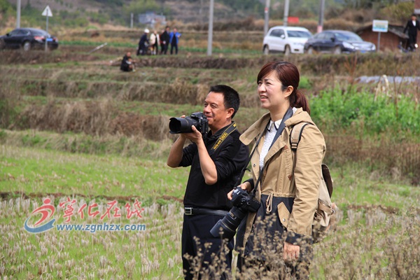 ?今年正月初七,鄒鈺琴(右)在石壁鎮陳塘村拍鬧春田活動。