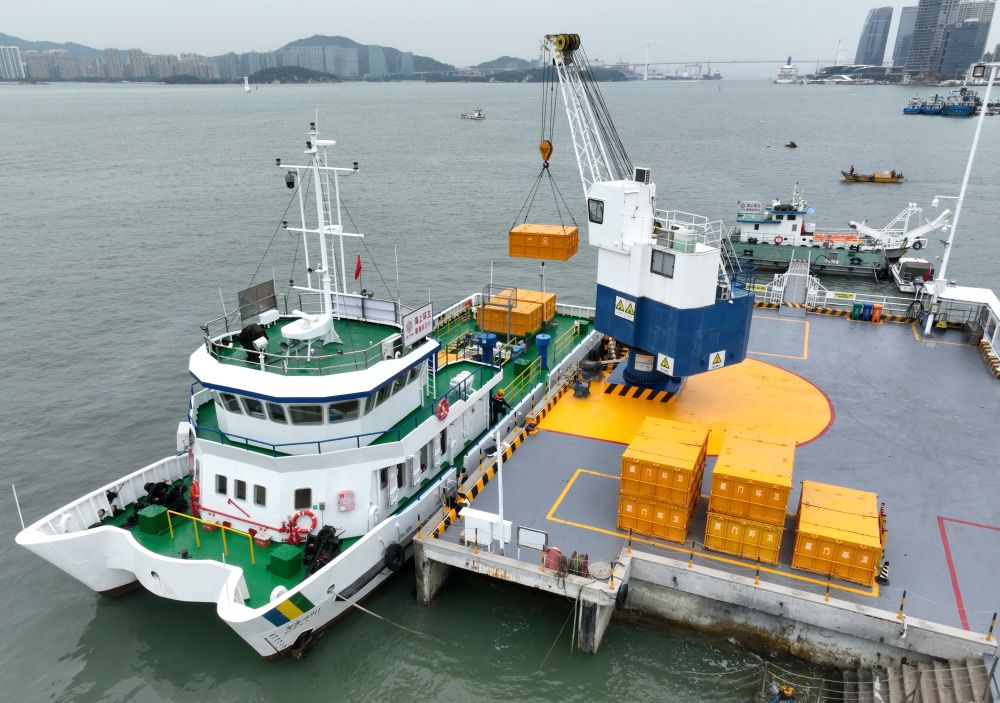 ??2024年1月25日,工作人員在廈門西堤海上環(huán)衛(wèi)碼頭吊運海漂垃圾(無人機照片)。新華社記者 林善傳 攝