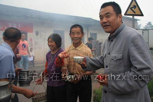 上午830分,當劇組人員冒雨來到陳塘村時,村口早早就響起了串串鞭炮聲,一個個染紅的雞蛋、一把把當地特產濕子花生塞到了劇組人員的手中,許多村民在陳塘紅軍醫院舊址前滿上一碗碗客家酒娘,就象招待久別的親人一樣。彭德懷的扮演者張秋歌端著一碗客家酒娘一飲而盡,風趣地對部分演職員說:“這種老區人民特有的米酒,我們的官兵都叫它‘紅軍可樂’,大伙說是不是呀?”許多演職員都一邊嘗著米酒,一邊與鄉親們熱情地交談著。