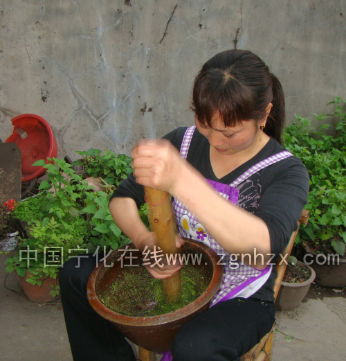 客家大嫂飛快的轉動擂持把青草藥擂爛