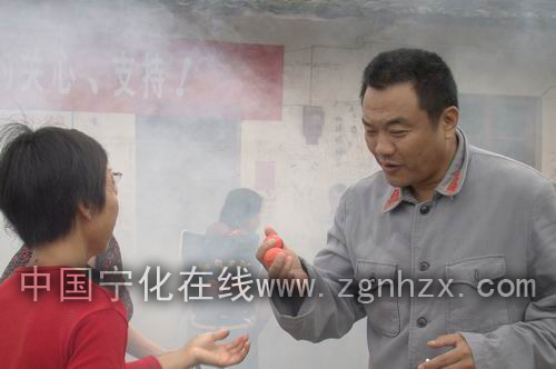 ??? 村民們忙著給“彭老總”送上溫?zé)岬木颇铩⑾愦嗟幕ㄉ?、鮮紅的雞蛋……整個(gè)村子頓時(shí)像炸開了鍋一樣。小張也樂呵呵地沖上前,拉著“彭老總”合影……