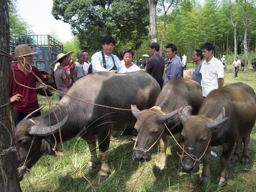 一頭頭耕牛一邊吃草料一邊漫不經心地等待買牛人來問津。買牛人與賣牛人三人一群、五人一堆地圍著,在他們討價還價的聲音中,時不時地還夾雜著幾聲牛叫。他們有的在觀察牛的毛色,判斷牛的健康狀況;有的在掰開牛嘴數牙,來斷定牛的歲數……據了解,隨著農業機械化耕作的推廣普及,農民養耕牛越來越少。店上村牛會也日漸衰落。但近年來,由于中央各項種糧優惠補貼政策的連續出臺,農民種糧積極性普遍高漲,隨之也帶來了耕牛交易市場的復蘇。已選中了一頭水牛的水茜鄉的農民老邱說,山壟田還是用牛方便。這幾年,國家對糧農的優惠政策越來越多,今天他買下這頭大水牛,明年打算多種些糧食。據悉,當日,共有300多頭耕牛前來“亮相”,完成交易200余頭。一頭強壯的耕牛一般都以2000-3000元的價格成交。這里的黃牛、水牛深受外地客商的歡迎,大部分銷往寧化與江西省毗鄰及周邊的縣鄉。