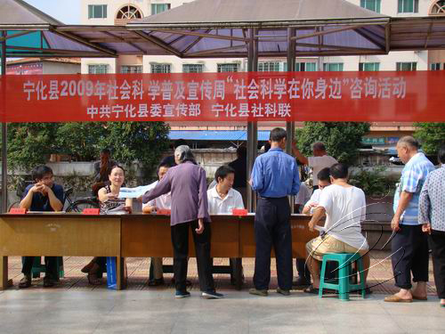919,寧化縣委宣傳部和縣社科聯(lián)聯(lián)合主辦的2009年社會(huì)科學(xué)普及宣傳周暨“社會(huì)科學(xué)在你身邊活動(dòng)”開幕式在中山街翠園廣場(chǎng)舉行,拉開了為期一周的社會(huì)科學(xué)普及宣傳周活動(dòng)。活動(dòng)現(xiàn)場(chǎng)掛滿社會(huì)科學(xué)普及宣傳畫,吸引了許多群眾駐足觀看閱讀,咨詢臺(tái)前圍滿群眾索要宣傳資料。縣委黨校、計(jì)生協(xié)會(huì)、文明辦、法學(xué)會(huì)、醫(yī)學(xué)會(huì)等單位參加了現(xiàn)場(chǎng)咨詢服務(wù)活動(dòng)。