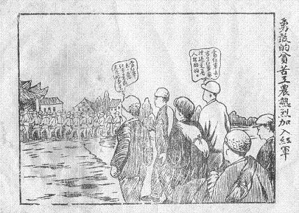 在擴紅運動中,廣大蘇區(qū)婦女積極開展擁軍優(yōu)屬活動,甚至直接上前線參軍參戰(zhàn),發(fā)揮了功不可沒的作用。年輕的婦女們甚至在紅軍戰(zhàn)斗時組織運輸隊、擔(dān)架隊、救護隊,直接上前線,身體力行地用鮮血和生命保衛(wèi)紅色政權(quán)。當(dāng)時廣為流傳的歌謠“韭菜開花一桿心,割掉髻子當(dāng)紅軍;保護紅軍萬萬歲,割掉髻子也甘心”,便是廣大婦女一心為革命、一切為革命的堅強決心的生動寫照。