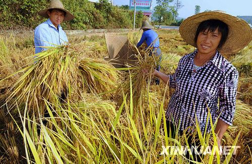 10月17日,福建省寧化縣中沙鄉(xiāng)農(nóng)民金桃(右)與家人一起在承包田里收割稻谷。