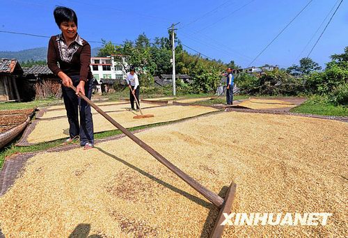 10月17日,福建省寧化縣安遠(yuǎn)鄉(xiāng)婦女在村頭翻曬稻谷。
