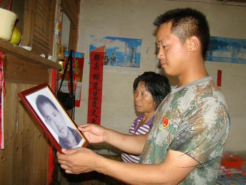 賴東華回到寧化家中端著父親的遺像久久凝視著