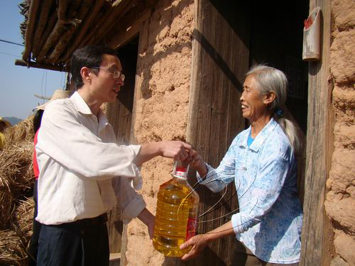 網(wǎng)友在給貧困老人送食用油(張瑞蘭/攝)