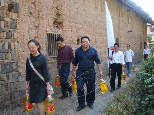 永輝超市員工與本網(wǎng)網(wǎng)友為貧困老人送食用油(張麗勍/攝)