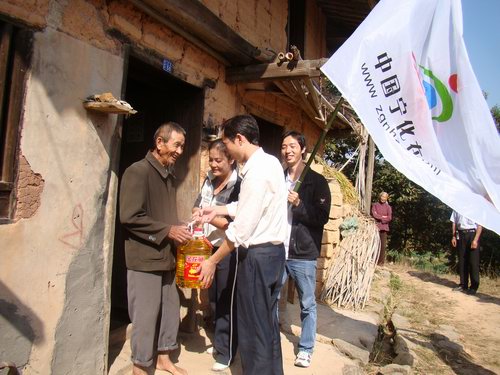 本網(wǎng)網(wǎng)友在給貧困老人送食用油(張林勇/攝)