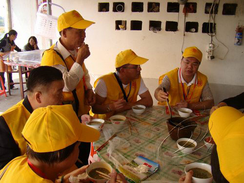 ??? 有人說,其實客家擂茶就是一個很好的中國式自助餐,做好很多很多菜任君選擇,可以拌茶拌飯,或者分開就食,在一片熟悉鄉音中邊敘邊吃,不知不覺中已然海飽,個個狀如企鵝,憨態可掬……客家擂茶,美哉!(張瑞蘭/圖)