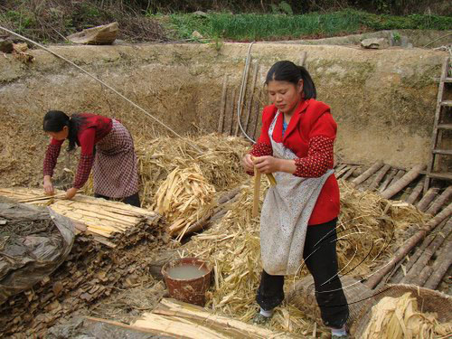 “當年蔡倫怎么造紙,現在我們就怎么造。”胡蘭山介紹說,竹紙作坊開工后,最少要8個工人同時生產。他們兩兩成對,分工明確,因為是流水作業,少一個工人,下一道工序就沒辦法進行。