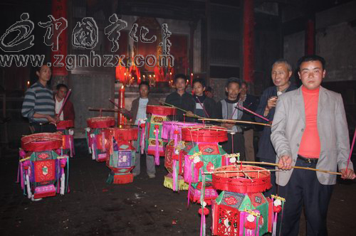 225晚,寧化曹坊鄉溫坊村溫室祠堂內一派忙碌景象,《大遷徙》攝制組工作人員也在忙著布線、點照明燈,他們將在這里拍攝村民們舞板凳龍鬧元宵的場景。該村每年春節從初十至元宵有舞板凳龍的習俗。晚七點,村中各戶男丁身杠裝有“角子燈” 的燈板陸續來到祠堂集合,燈板一一連接好后,給燈板上的花燈點上燭火,“龍”就亮了起來。在祠堂內舞動幾圈后,村民們在“龍頭”的帶領下,按事先商定的路線沿著村子逶迤推進,所到之處,村民燃放煙花爆竹迎接,整個村莊火樹銀花,鼓樂齊鳴,火龍蜿蜒,景象蔚為壯觀。據村中老者介紹,該村元宵期間舞板凳龍的習俗已傳承600多年。