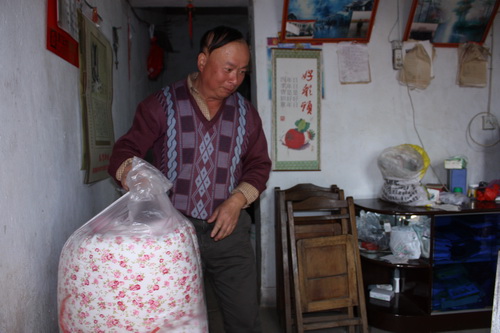 在泉上華僑農(nóng)場(chǎng)八隊(duì),記者見到了49歲的曾漢平,他正從泉上趕圩歸來,摩托車后架上,綁著一床棉被。“昨天晚上黃亞友半夜敲我的門,說晚上睡覺冷,今天給他買了床被子?!痹鴿h平笑著說。