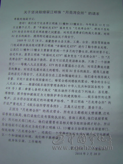 325,寧化縣翠江明珠11-13號(hào)樓20多戶業(yè)主,拿著聯(lián)名起草的《關(guān)于堅(jiān)決要求取締“月亮灣會(huì)所”的請(qǐng)求》向有關(guān)部門大吐苦水。說(shuō)位于中環(huán)路翠江明珠11-13號(hào)樓二樓的“月亮灣音樂(lè)會(huì)所”經(jīng)常營(yíng)業(yè)到深夜影響居民休息,強(qiáng)烈要求取締該會(huì)所,還業(yè)主們一個(gè)寧?kù)o的生活環(huán)境。
