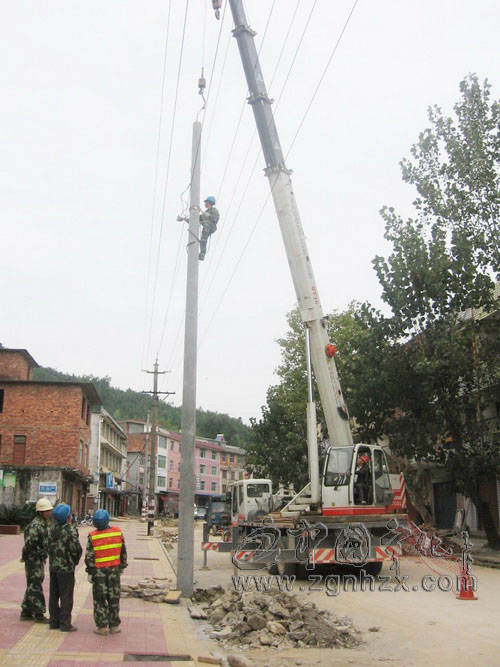 10月21日,在寧化縣濟村鄉街上,只見一輛大吊車在指揮人員的指揮下,正把一根根舊電桿緩緩拔起后,再把新電桿重新豎立,電力施工人員忙著進行組裝架線,寧化縣供電公司的員工們正在對濟村鄉濟村村進行農村電氣化改造建設緊張施工。