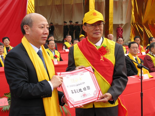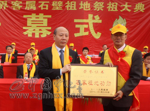 122上午,劉道崎市長在第16屆世界客屬石壁祖地祭祖大典上,代表三明市人民政府授予姚森良先生“客家祖地功勛”榮譽,以表彰他多年來對石壁客家祖地作出的突出貢獻(xiàn)。