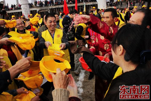 發彩寓意發財,前來祭祖的客家子弟紛紛拿著帽子接司儀散下來的米