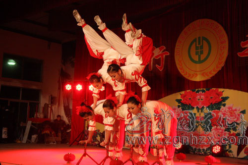 ???? 當(dāng)晚,演出現(xiàn)場人潮涌動(dòng),掌聲此起彼伏。晚會(huì)在繩技表演《同一個(gè)夢想》中拉開帷幕。表演者們甩動(dòng)著繩圈擺出各式造型表演翻滾、跳躍等動(dòng)作,引來在場觀眾的一片驚嘆。《節(jié)日-女子造型》、《頂花壇》、《蹬技》、《魔術(shù)-脫困》、《柔術(shù)滾燈》《雜耍-快樂的炊事員》等精彩的節(jié)目逐一登場,現(xiàn)場觀眾叫好連連。由表演者在層層椅子壘成的九米多高空中表演單手倒立的《高椅倒立》可謂驚險(xiǎn)刺激,令觀眾屏氣凝神、嘆為觀止。當(dāng)表演者躺著用腳將200多斤大缸再加上兩個(gè)人的體重?fù)纹鸩⑥D(zhuǎn)動(dòng)的《蹬大缸》,演出氣氛的達(dá)到了高潮。最后演出在全體演員的《大武術(shù)》中圓滿閉幕。演出結(jié)束時(shí)廖金輝上臺(tái)和演員們逐一握手,并問好。