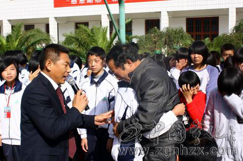 “現在請同學們站起來,握住父母的雙手?!銈兪欠窀惺艿礁改改请p粗糙的手,是否看到父母為了你、為了家操勞,原本烏黑的頭發如今已是白發點點?!痹?st1:PersonName w:st="on" ProductID="陳" xmlns:w="#unknown2" xmlns:st1="#unknown1">陳老師講到愛父母時。所有學生都在他的鼓勵下,站起來緊緊握住坐在身邊父母的雙手??粗改隔W角爬上的銀絲和漸添皺紋的面容,大家都不由自主流下了淚水。