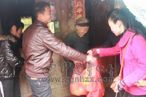 ??? 廖子昌夫妻、兒子均智障,母親82歲,網(wǎng)友們來到廖子昌,出來迎接的是白發(fā)蒼蒼的老奶奶,當(dāng)網(wǎng)友送上豬肉、白酒等年貨,遞上紅包,老奶奶高興得合不攏嘴,嘴里不停地說:“你們這么好,要一百歲啊、身體健康、萬事如意、多多發(fā)財(cái)……”