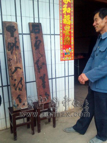 ??? “這副楹聯(lián)也算經(jīng)歷了幾次災難呢?當時它們被親族當作蓋雞籠的蓋板,后來我發(fā)現(xiàn)了才把它們洗干凈藏起來。誰知道,98年一場大火把原本偌大的宅院燒得一干二凈,什么也沒有帶出來,只搶救出來了這副聯(lián)子。”曾叔說到這有點暗自傷神。