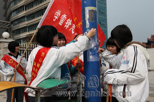 ??? 3月11日上午,寧化縣城東中學300多學生走上翠城(寧化城關別稱)街頭,或清理綠化帶中的垃圾,或擦洗櫥窗,或鏟除“牛皮癬”,用自己的雙手為清潔環境、扮靚城市做貢獻。圖為該校七年級(16)班的學生在中環路鏟除電線桿上的“牛皮癬”。(羅旺水? 馬胤文)