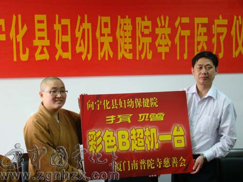 ??? 5月16日,廈門南普陀寺慈善會捐贈彩色B超機儀式在寧化縣婦幼保健院舉行,南普陀慈善會為該院捐贈一臺套價值30余萬元的全數(shù)字彩色B超機。寧化縣衛(wèi)生局、縣婦幼保健有關人員參加了捐贈儀式。