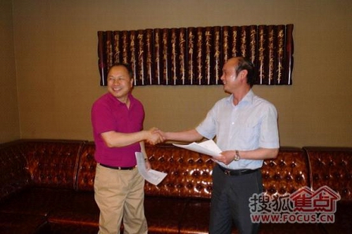 縣長楊勝(右)與萬亞集團董事局主席方升寬(左)握手并交換文書(圖片來源于搜狐焦點網(wǎng))