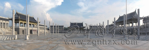 ??? 占地1萬平米,可容納5000-6000人,由看臺、廣場、祭祀大殿三大部分組成,是祭祖大典舉行的主場所,廣場上屹立著16根文化柱,每根文化柱代表了一段的客家遷移文化史,16根柱子則組成了一部客家遷移文化史,記載著客家人南遷、開拓疆土、發(fā)展壯大的歷史。柱子頂部采用祥云紋樣雕刻,寓意客家天下太平如意;柱子上部采用葛藤紋樣雕刻,寓意客家美德佳話世代流芳;石柱中部采用高山流水紋樣雕刻, 寓意客家山高水長,山清水秀之意;在石柱基部雕刻有客家人遷徙繁衍的歷史,起到劃分廣場空間的作用。兩邊的亭子里放的是客家先賢的銅塑,這些雕塑體全部采用青銅鑄造,臺座采用花崗巖石材。