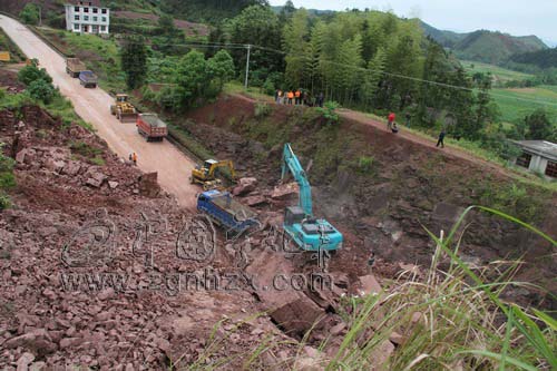 ??? 30分鐘后,隊伍趕到石壁鎮藍田村。眼前的情況,讓方幫駿倒吸了口涼氣——路段兩旁是山,中間是公路,呈V字形,山體溜方將這個V字滿滿填上,目測土石方約5000立方米,受堵路段長達40米!