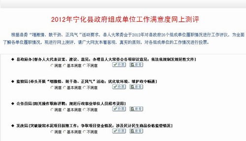 評價政府成員單位一年的工作好不好,滿意度高不高,不僅要看縣級領導的意見,機關干部、服務對象的看法,網民的網上評價也將成為重要的評價指標。5月2日,寧化縣人大常委會在當地的主流媒體--- 寧化在線網站開辟“2012年寧化縣政府組成單位工作滿意度網上測評”專欄,誠邀廣大網友對縣政府26個組成單位的工作情況及滿意度投上神圣的一票。