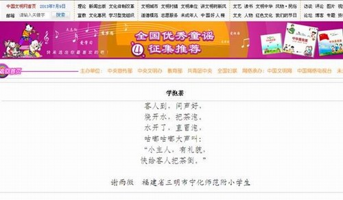 7月5日,第四屆全國優秀童謠網上評選活動開始,福建省共有四件作品入圍。其中,寧化師范附小學生謝雨微作品《學泡茶》入圍網上評選候選篇目。
